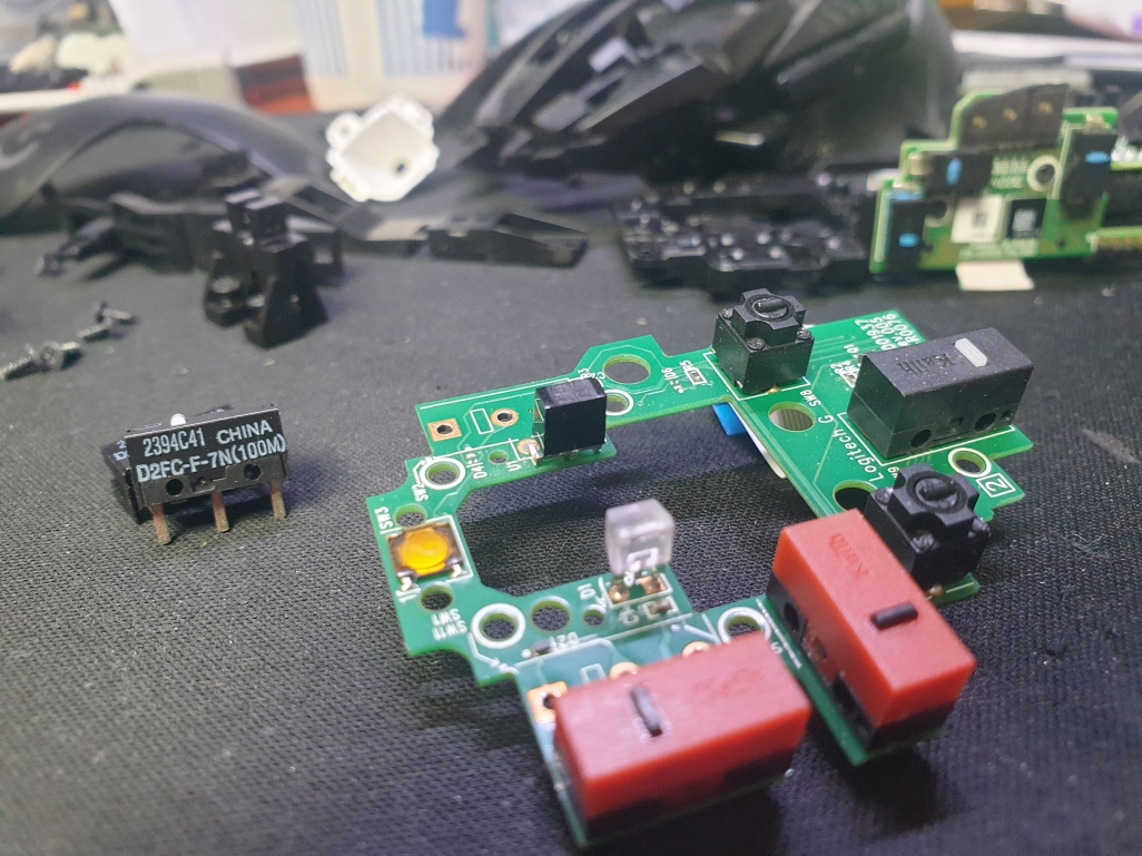 버튼내 스위치불량으로 새 스위치 D2FC-F-7N(100M) 좌우교체 수리 진행합니다. 추가로 측면 앞으로가기 더블클릭 뒤로가기 잘안눌리는 문제로 앞뒤스위치도 교체합니다.